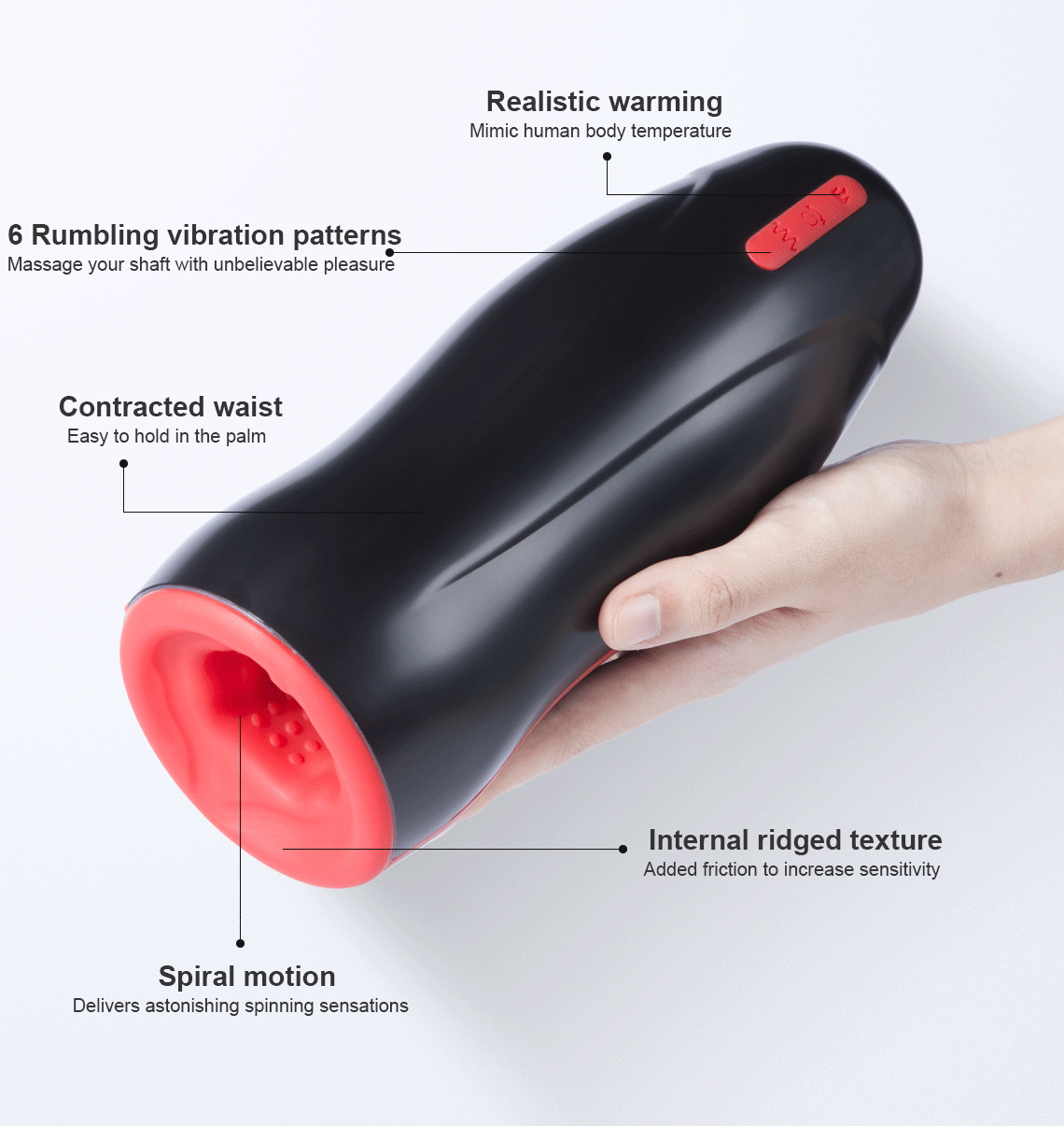 Greater power infused into a more straightforward design, that is Rory, a unique spinning vibrating masturbator capable of building up your senses to the max, until the tingling and shivering start and spread all over your body. Rory spins and vibrates so intensely that you can’t help tensing your muscles hard, and the release is felt deep inside. A more special warming feature channeled through the smooth velvet skin delivers a natural touch feeling. You can feel the warmth, pulse, and surges.
