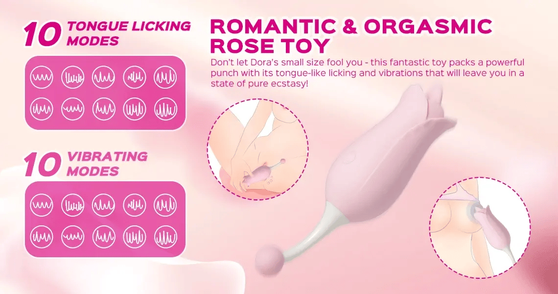This rose toy combines silky smooth tongue-licking and strong earthquake vibrations with 10 tongue-licking modes & 10 vibration modes. From gentle flirting to wild licking, experience extreme climax with just a soft touch. Grip its ergonomic shape and activate any of the 10 thrilling vibrations or delicate tongue-licking modes. Whether you’re in the mood for gentle or intense pleasure, Dora has got you covered!