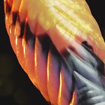 Smooth insertion with a tapered beak-shaped tip and heightened friction from raised circular ridges. Experience deeper penetration with a large helical ridged shaft. Enjoy a momentary respite with a slimmed waistline, while thrill-seekers revel in the raised spherical knot. Plus, the feathered bottom tantalizingly caresses your entrance.